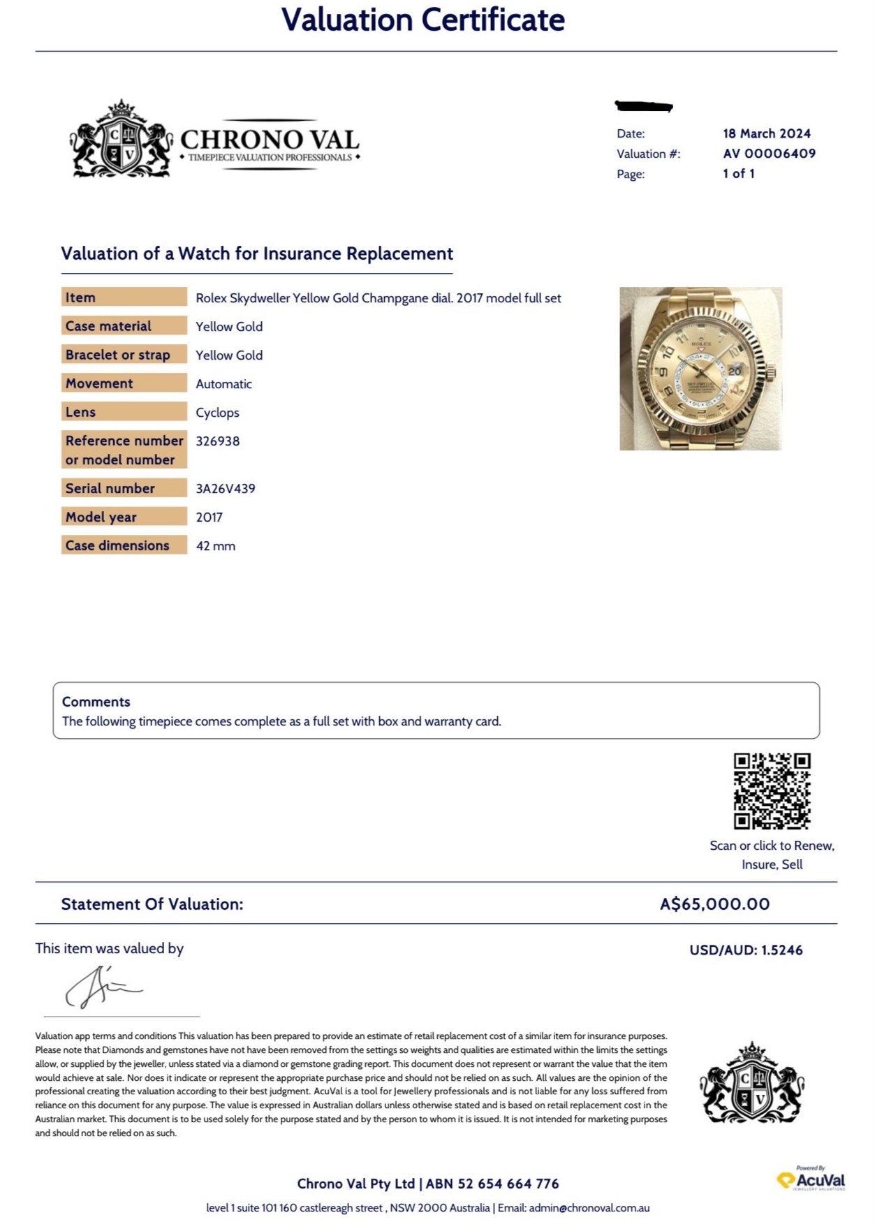 A Watch Valuation Certificate is AUD$150.00.