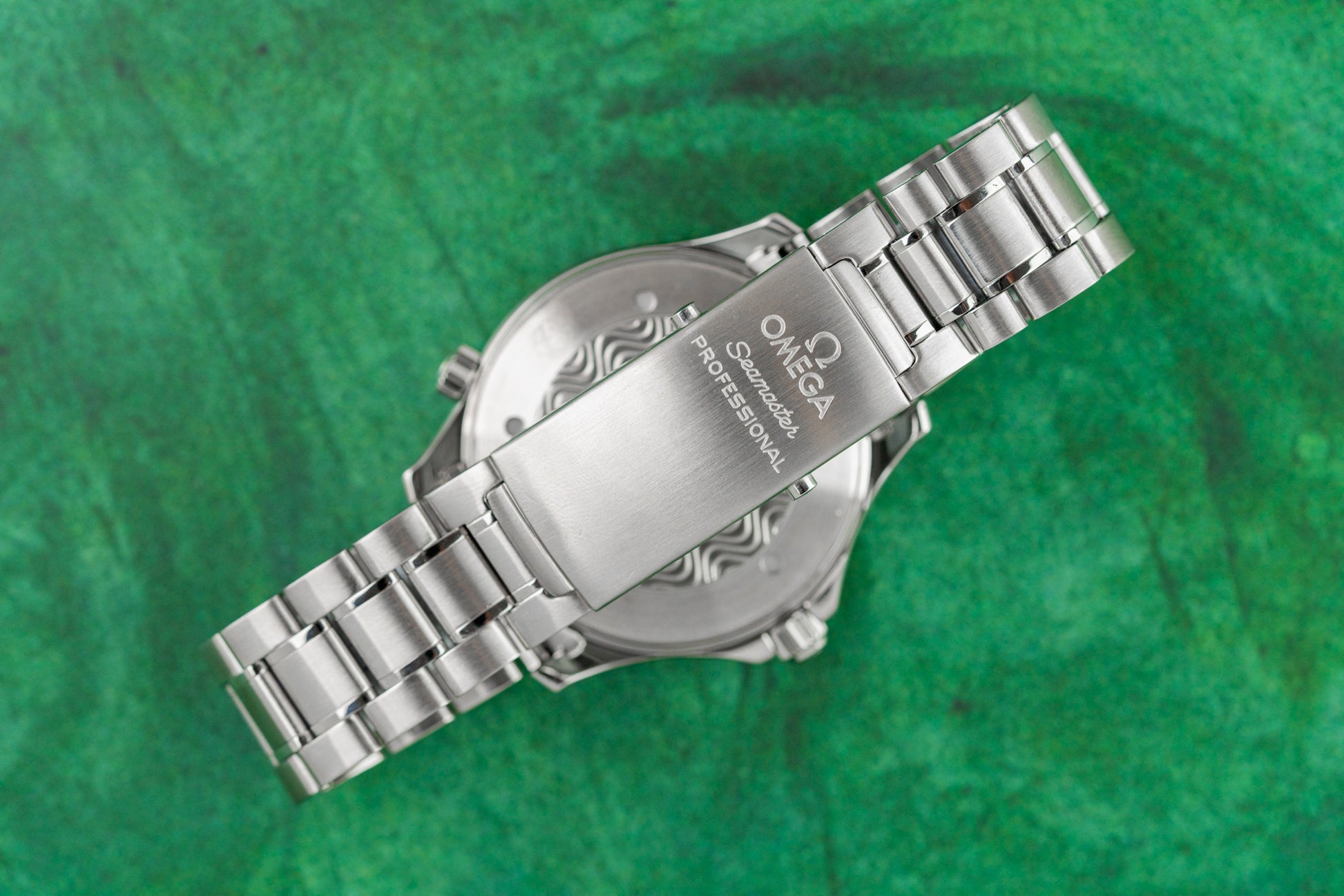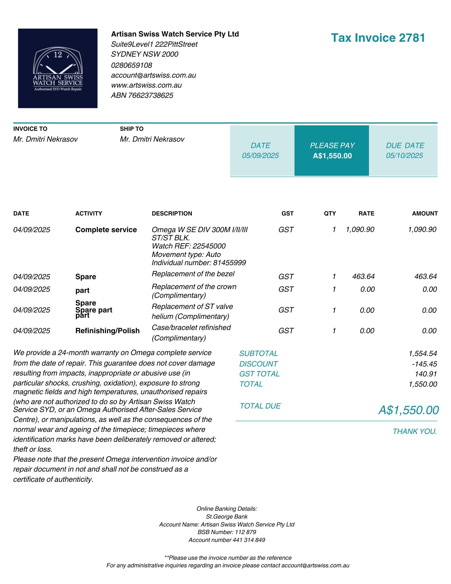 The watch comes with box, cards, service receipt, omega service pouch. No original warranty card is present.